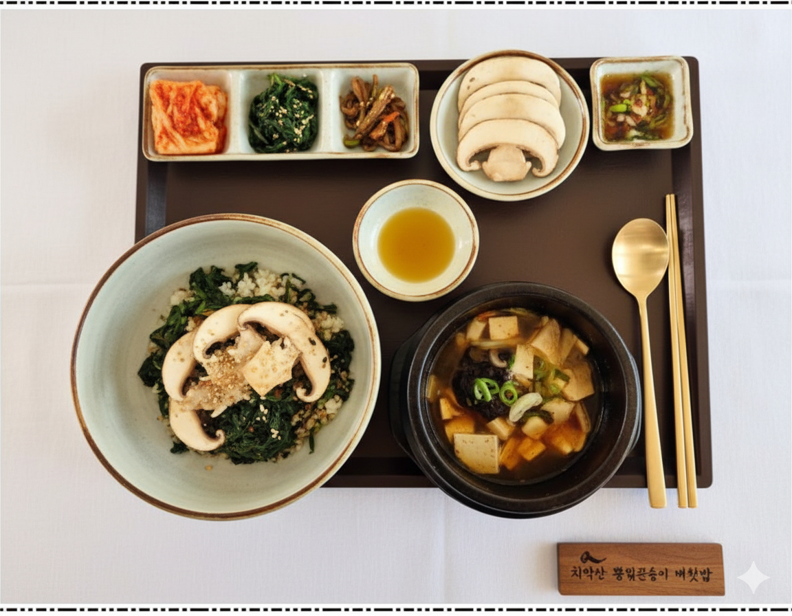 원주 치악산 뽕잎과 큰송이버섯이 조화를 이룬 건강 비빔밥. 향긋하고 구수한 풍미가 특징입니다.
