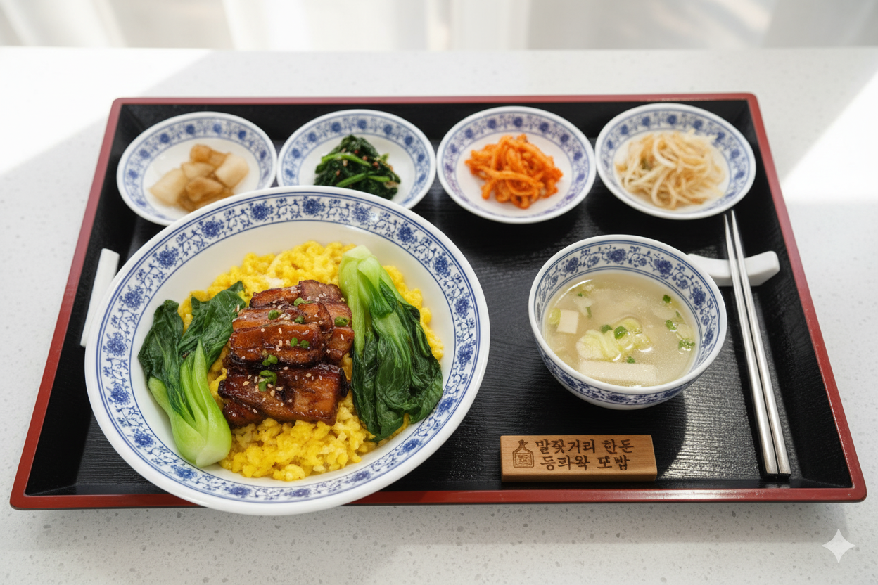 겉은 바삭하고 속은 촉촉한 동파육에 달걀 스크램블과 청경채를 올려낸 덮밥. 직접 담근 동치미와 함께 즐기는 건강한 한 끼입니다.