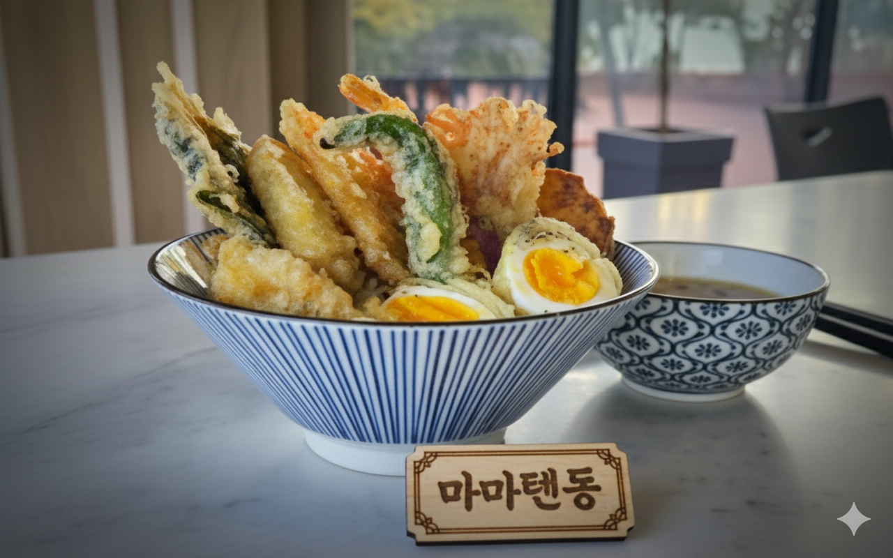 익산 명물 고구마와 양파, 단호박, 새우 등을 바삭하게 튀겨 올린 텐동. 고소한 풍미와 압도적인 비주얼로 사랑받습니다.