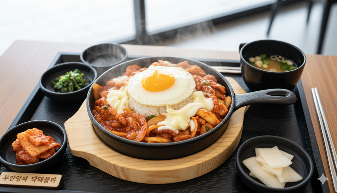 무안 양파와 낙지, 돼지고기를 철판 위에서 볶아내어 매콤한 풍미를 자랑합니다. 치즈와 계란이 더해져 더욱 풍부합니다.