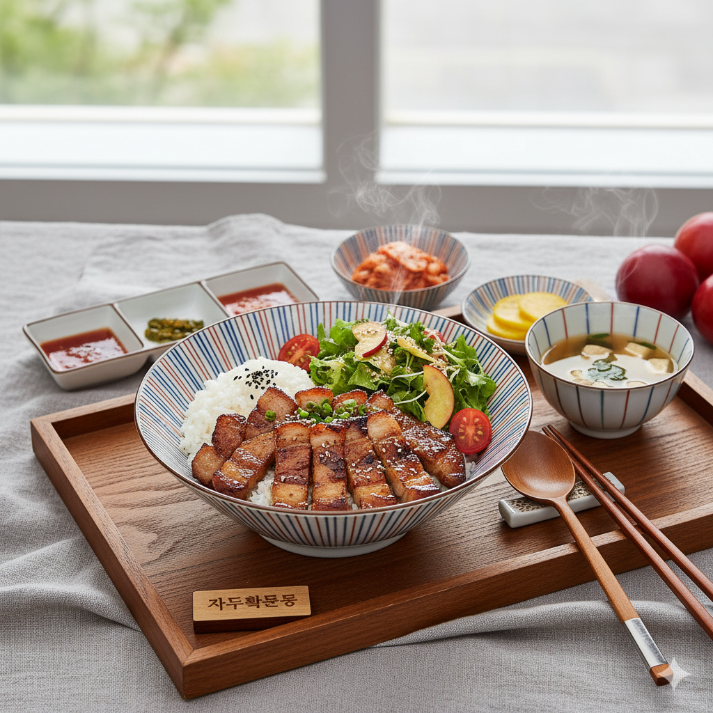 김천 명품 흑돼지 덮밥 위에 상큼한 자두청 샐러드를 곁들여 달콤새콤한 풍미를 완성했습니다.