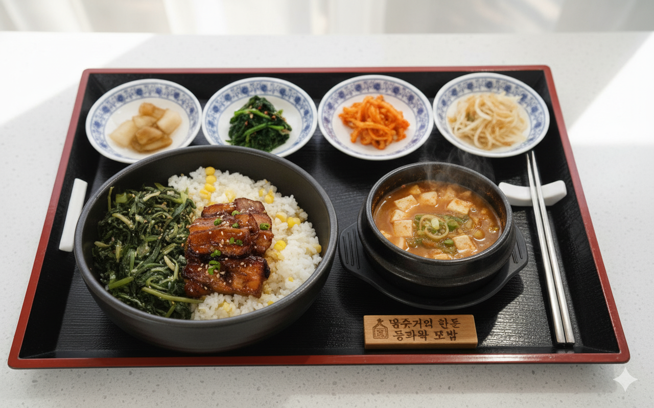 용인 특산 돼지고기를 푸짐하게 넣고 우려낸 깊은 국물은 속을 시원하게 풀어줍니다. 아삭한 오이지와 버섯무침이 곁들여져 든든한 보양식 한 끼로 제격입니다.